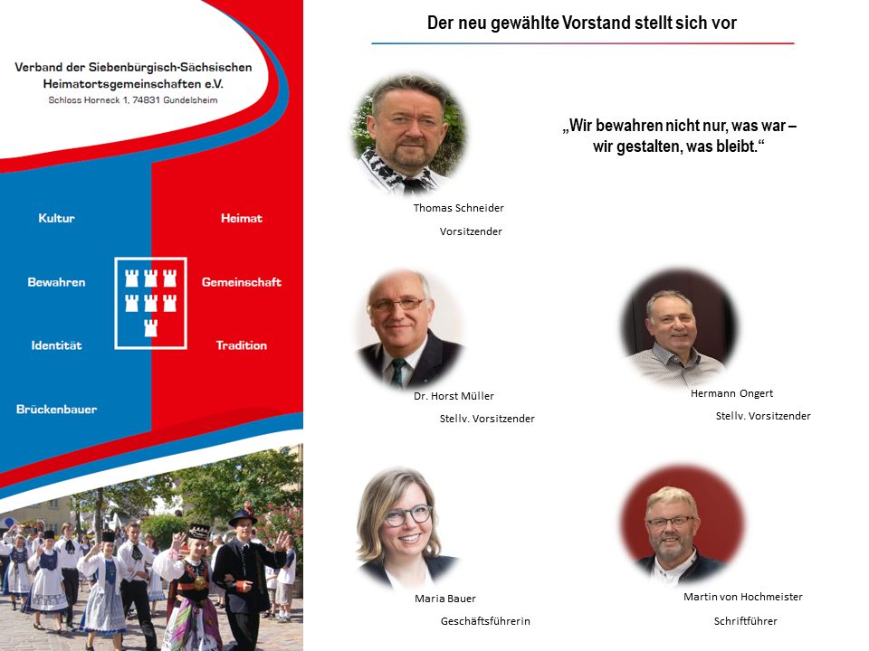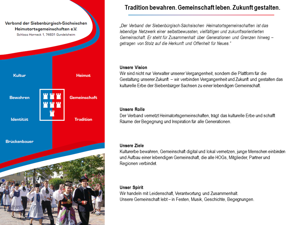 Gemeinsam gestalten wir die Zukunft des Verbands der Siebenbürgisch-Sächsischen Heimatortsgemeinschaften. Mit Erfahrung, Herz und Engagement setzen wir uns für den Zusammenhalt unserer Gemeinschaft, die Bewahrung unseres kulturellen Erbes und die Brücke zwischen den Generationen ein.